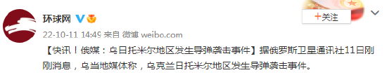 [快訊!俄媒:烏日托米爾地區發生導彈襲擊事件]據俄羅斯衛星通訊社11日剛剛消息,烏當地媒體稱,烏克蘭日托米爾地區發生導彈襲擊事件。